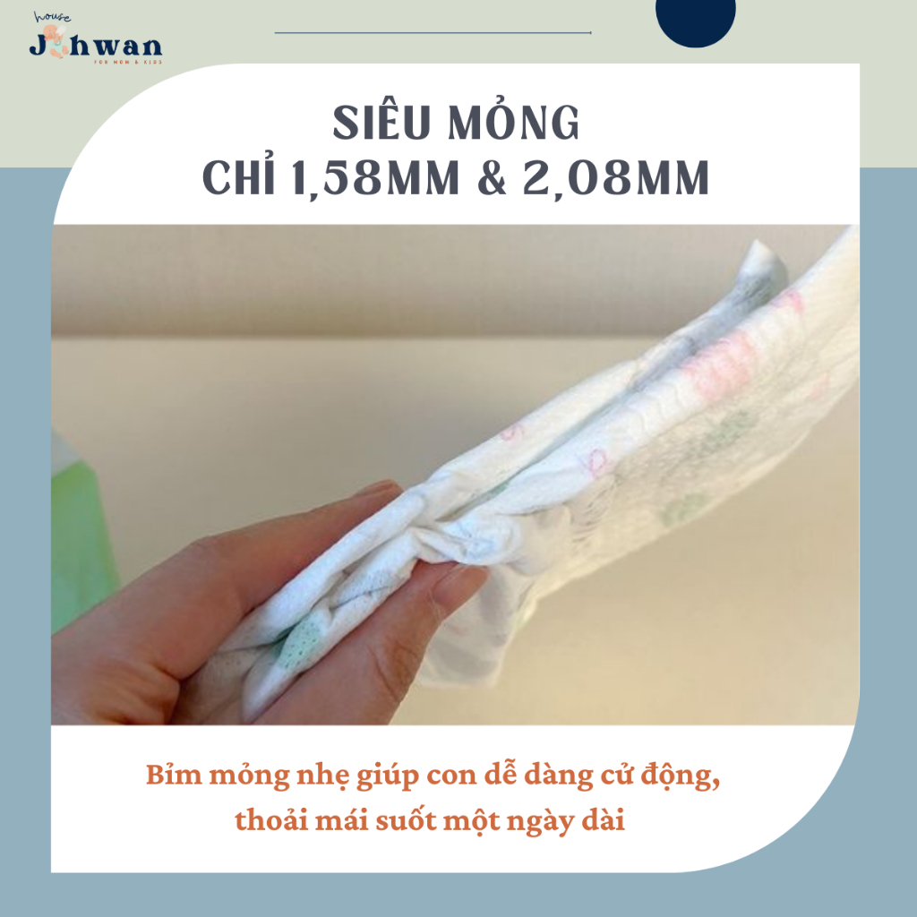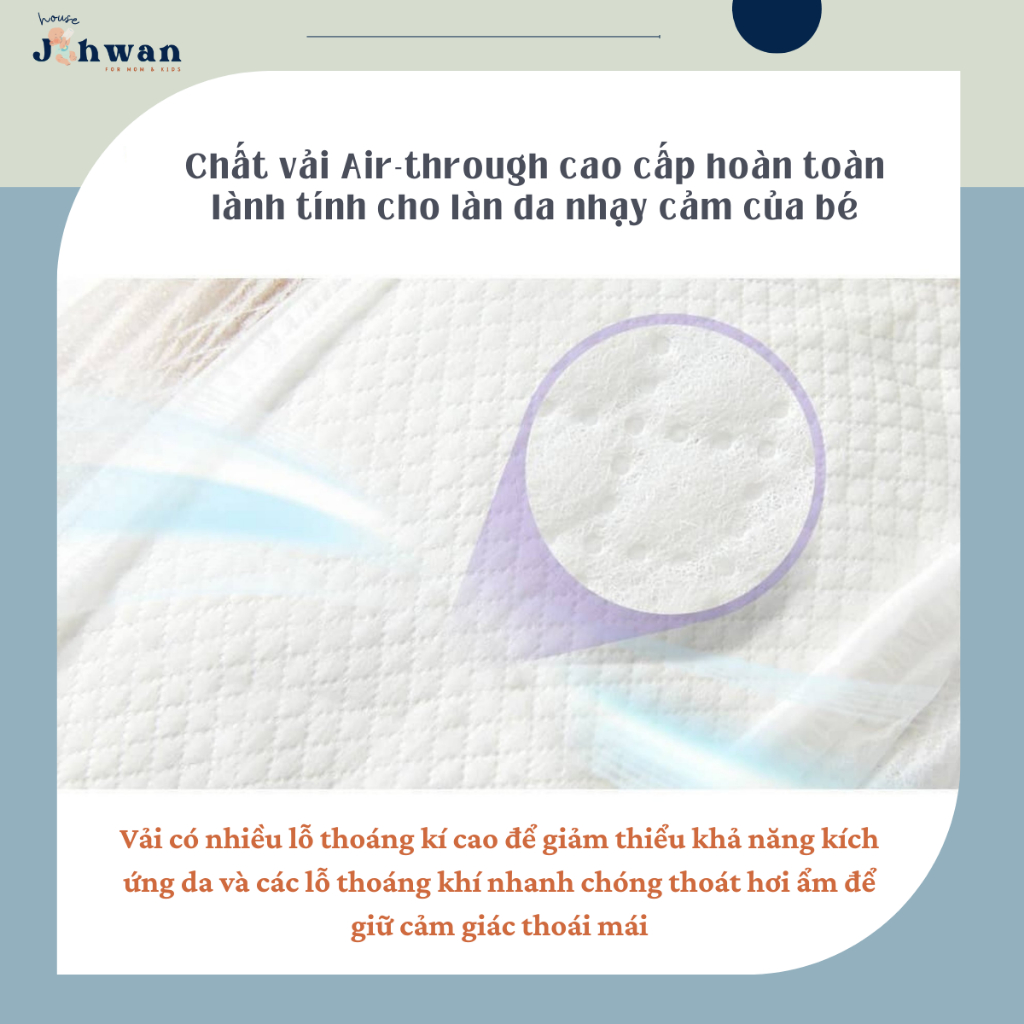 – Vải Air-Through ở cả 2 bề mặt của bỉm giúp tăng cường độ thông thoáng, da luôn khô và hạn chế tuyệt đối tình trạng kích ứng da.