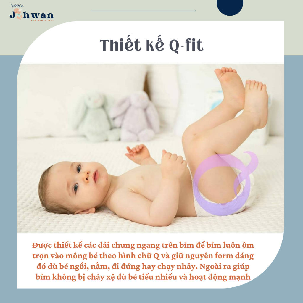 – Q-fit: Được thiết kế các dải chun ngang trên bỉm để bỉm luôn ôm trọn vào mông bé theo hình chữ Q. Ngoài ra hệ thống chun tăng cường trên toàn bộ bỉm cũng giúp bỉm không bị chảy xệ dù bé tiểu nhiều và hoạt động mạnh.