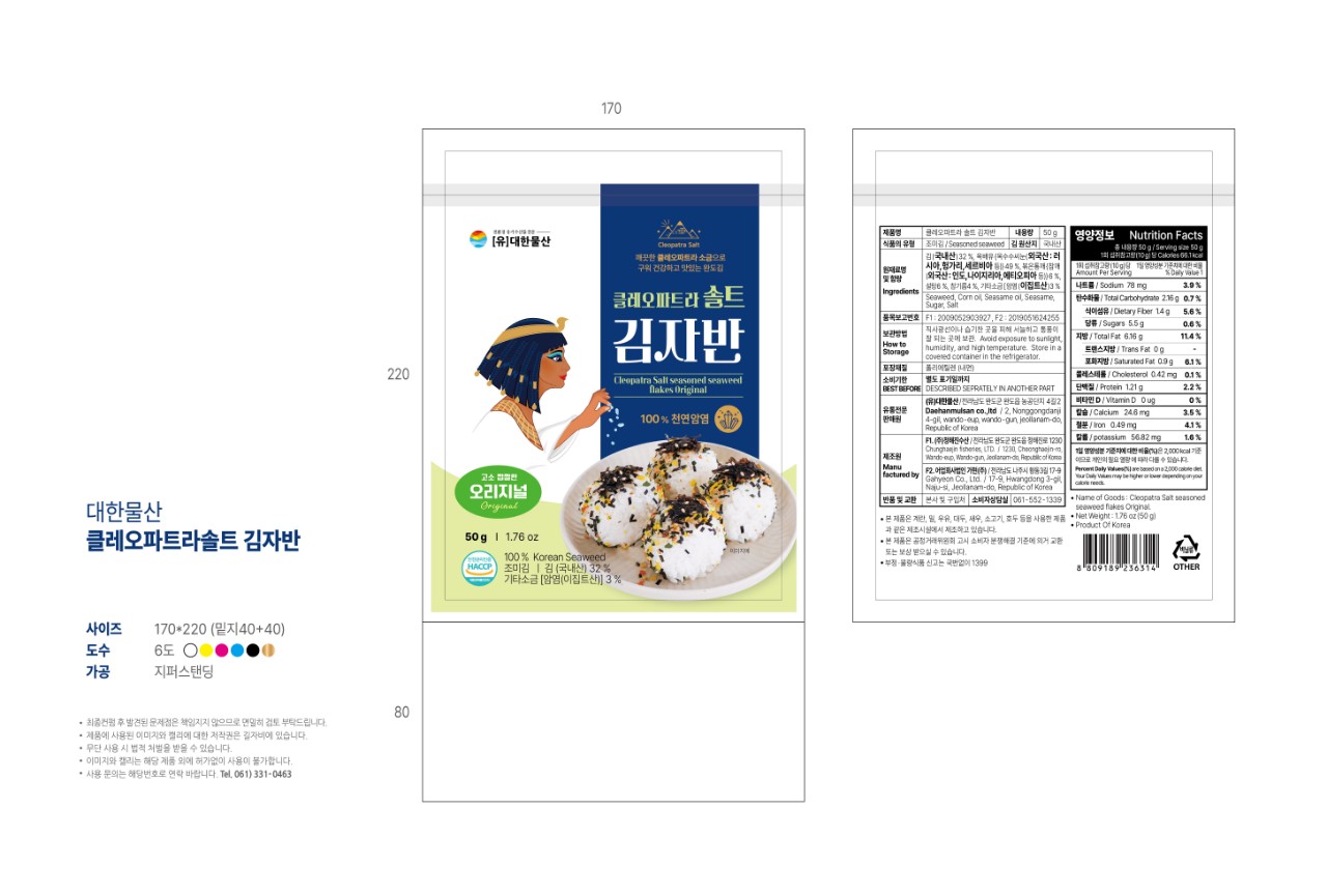 Rong biển muối Cleopatra là sản phẩm được làm từ rong biển mọc ở khu vực sạch nhất Hàn Quốc, và được bổ sung thêm muối sạch từ Ai cập giúp ngăn ngừa ung thư và tăng cường chức năng tuyến giáp do nồng độ muối không quá mặn như muối biển thông thường.